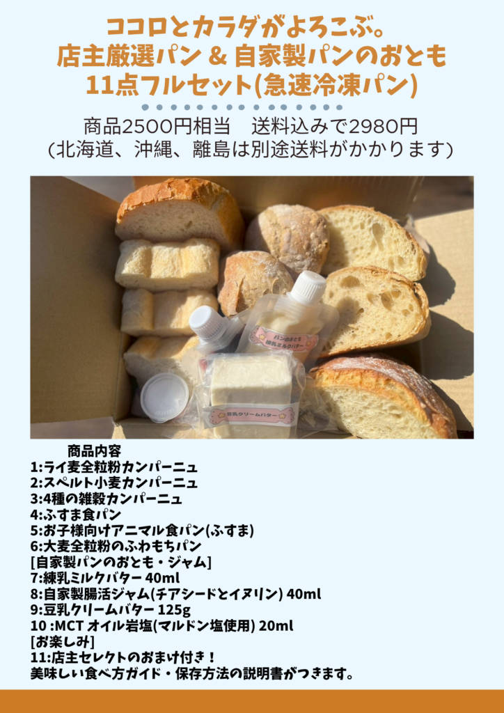 ご家族皆様でお楽しみいただけるセットをご用意いたしました。三種類の全て異なるカンパーニュ。低温長時間熟成に加え、異なる二種類の岩塩を使用しております。北海道産の粉を使用したふんわりパンは定番のふすま食パンをはじめ、お子様にお楽しみいただけるアニマル食パン、そして当店のロングセラー商品である大麦粉ふわもちパンが入ります。厳選した国産大麦粉は香ばしさともっちり感があります。 これらに加え、自家製おともや腸活ジャム。当店で使用している本当においしい豆乳クリームバター、そして体を気遣うお客様向けにMCTオイル+岩塩を。これらに店主の気持ちをのせたおまけをお付けいたします。